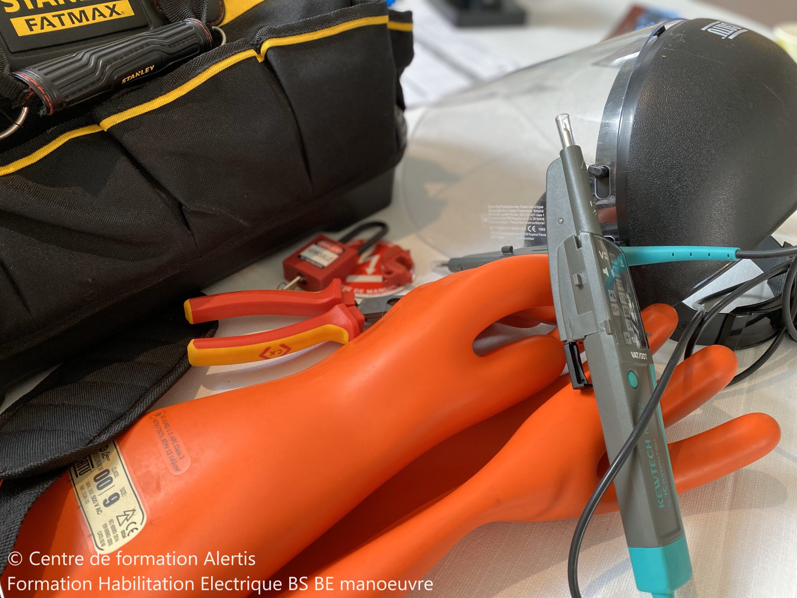 – Matériel de sécurité électrique : cadenas, vérificateur d’absence de tension, gants d’électricien, casque et visière de sécurité